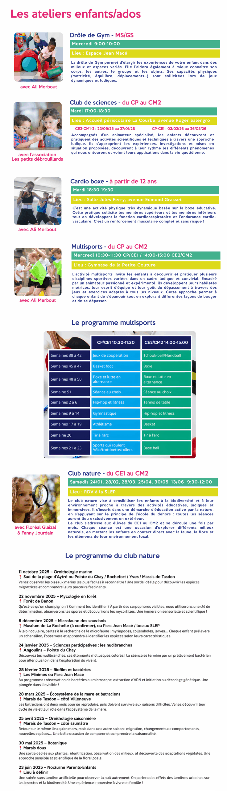 La SLEP propose un panel d’activités culturelles et sportives à destination de tous les âges. Convaincus que la pratique culturelle et sportive participe à l’émancipation du citoyen peu importe son âge, nous mettons en place une tarification solidaire qui adapte les tarifs en fonction des revenus de chacun. Les activités sont animées par des professionnels qualifiés.