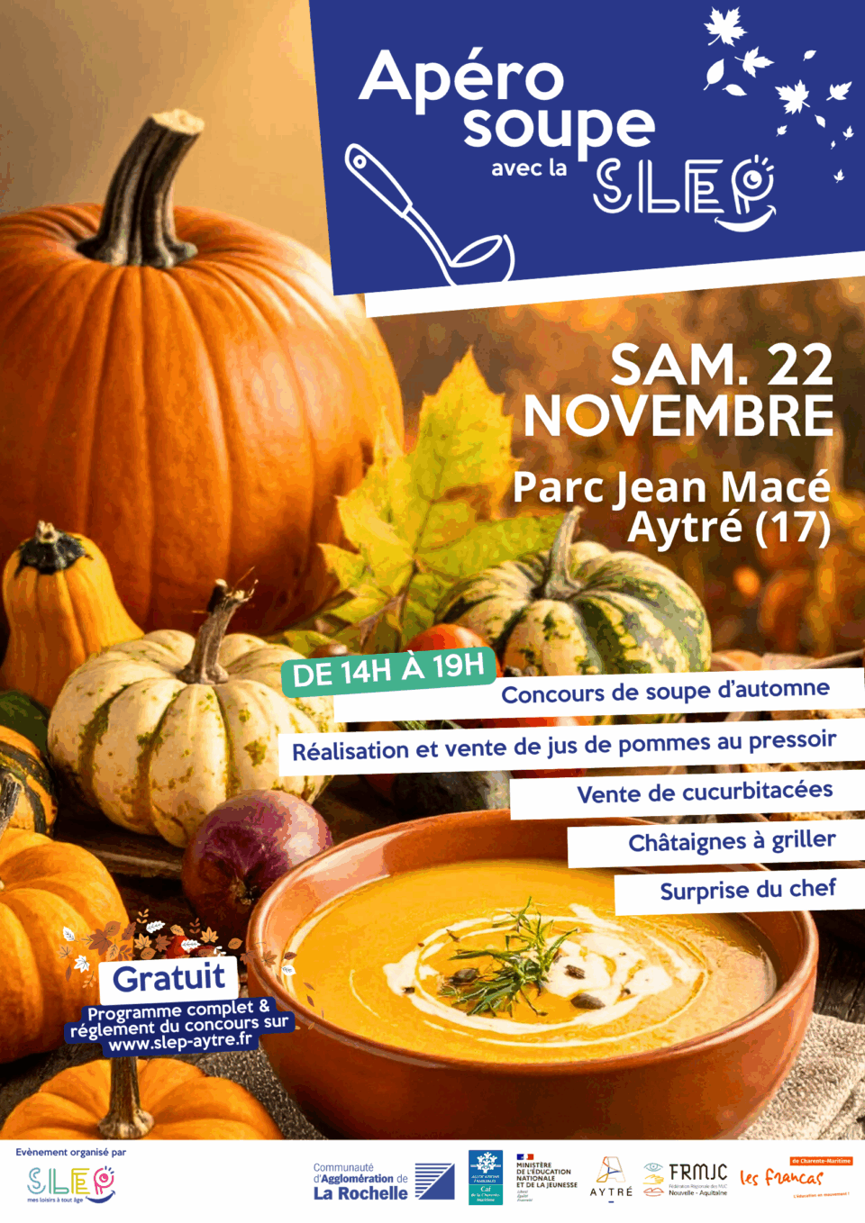 Le samedi 22 novembre, direction le Parc Jean Macé à Aytré pour un après-midi gourmand et animé avec la SLEP ! Au menu : concours de soupe, pressage de pommes, légumes rigolos, châtaignes grillées et la surprise du chef ! Une belle occasion de se retrouver, de goûter, de rigoler… et de se réchauffer ensemble ! Pensez à apporter votre récipient pour la dégustation !
