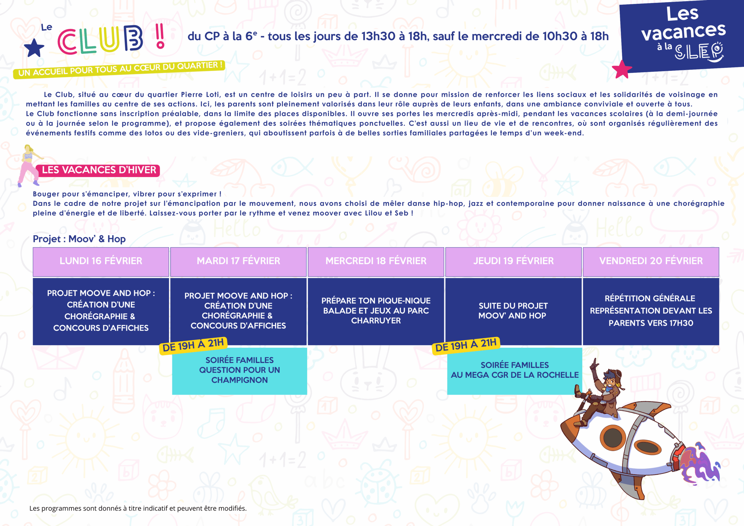 Le Club fonctionne sans inscription préalable, dans la limite des places disponibles. Il ouvre ses portes les mercredis après-midi, pendant les vacances scolaires (à la demi-journée ou à la journée selon le programme), et propose également des soirées thématiques ponctuelles. C’est aussi un lieu de vie et de rencontres, où sont organisés régulièrement des événements festifs comme des lotos ou des vide-greniers, qui aboutissent parfois à de belles sorties familiales partagées le temps d’un week-end.